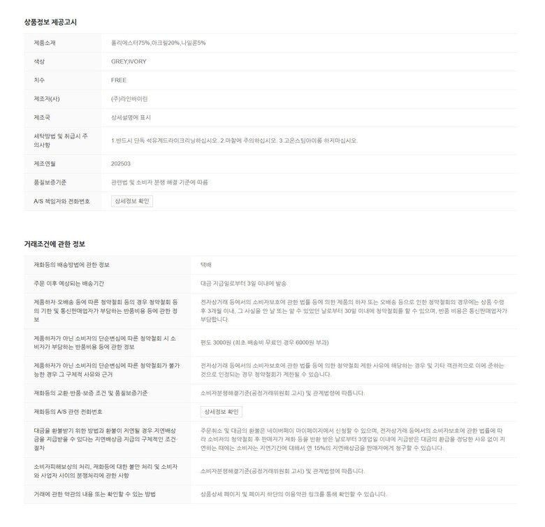 | 6. 세탁방법 및 취급시 주의사항 | 상품상세참조 |