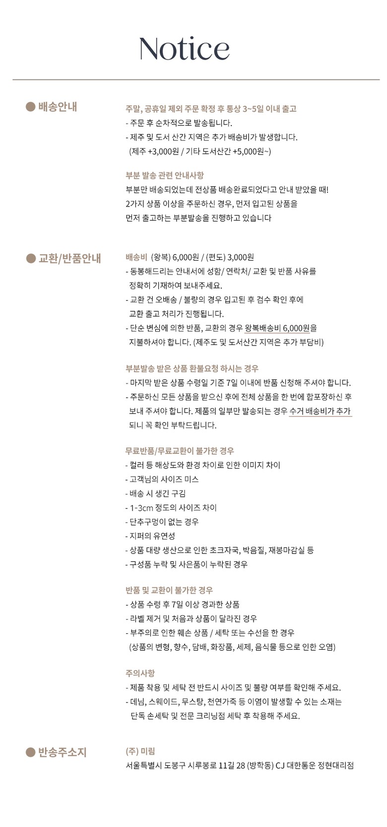 | 1. 제품 소재 (섬유의 조성 또는 혼용률을 백분율로 표시, 기능성인 경우 성적서 또는 허가서) | 상세페이지 참조 |