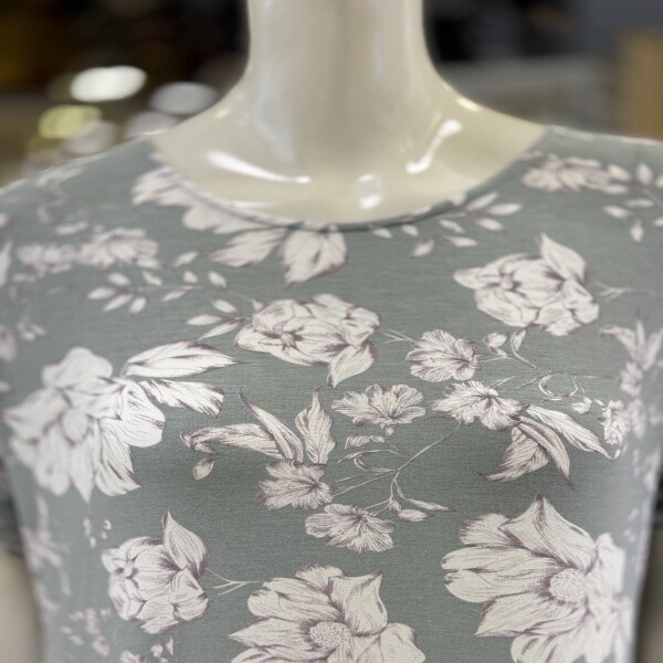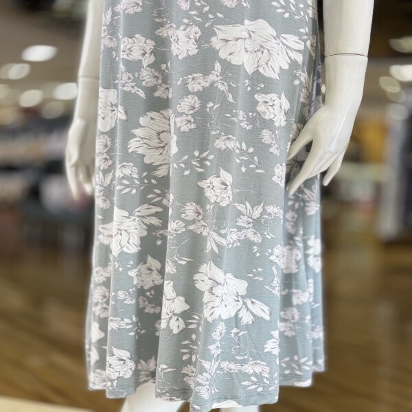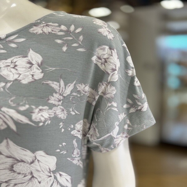 은은한 그린 색상 바탕으로해서 꽃무늬가 그려져 여성스럽고 고급스럽게 입을 수 있고 몸에 감기는 스타일이 아니라 더욱 편하게 입을 수 있어요^^