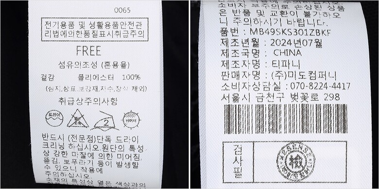 | 1. 제품 소재 (섬유의 조성 또는 혼용률을 백분율로 표시, 기능성인 경우 성적서 또는 허가서) | 겉감-폴리에스터100% |