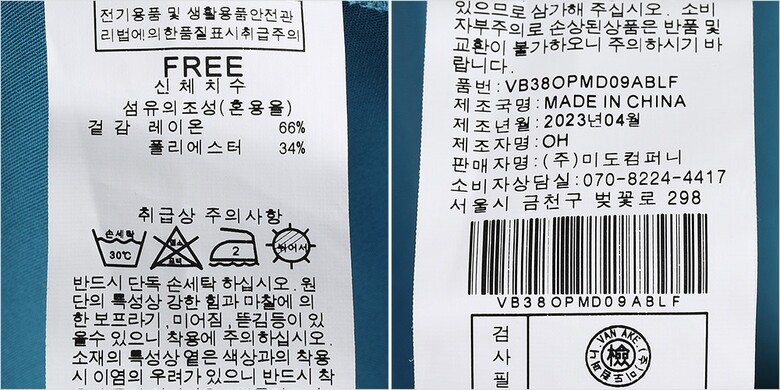 | 1. 제품 소재 (섬유의 조성 또는 혼용률을 백분율로 표시, 기능성인 경우 성적서 또는 허가서) | 겉감-폴리에스터34% 레이온66% |
