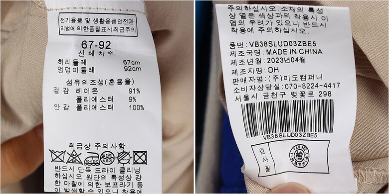 | 1. 제품 소재 (섬유의 조성 또는 혼용률을 백분율로 표시, 기능성인 경우 성적서 또는 허가서) | 겉감-폴리에스터9% 레이온91% 안감-폴리에스터100% |