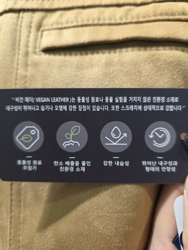 | 1. 제품 소재 (섬유의 조성 또는 혼용률을 백분율로 표시, 기능성인 경우 성적서 또는 허가서) | 겉감 : 인조가죽(합성가죽) 100% 안감1 : 폴리에스터 100% 안감2 : |