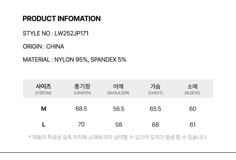 | 1. 제품 소재 (섬유의 조성 또는 혼용률을 백분율로 표시, 기능성인 경우 성적서 또는 허가서) | 겉감:나일론 95%, 폴리우레탄 5% |