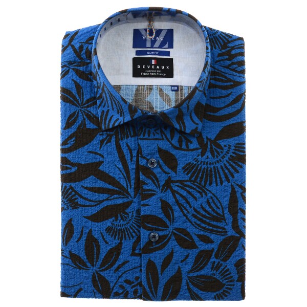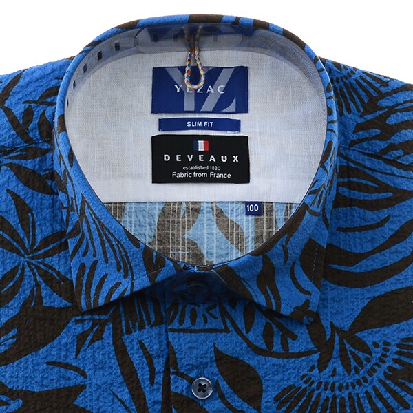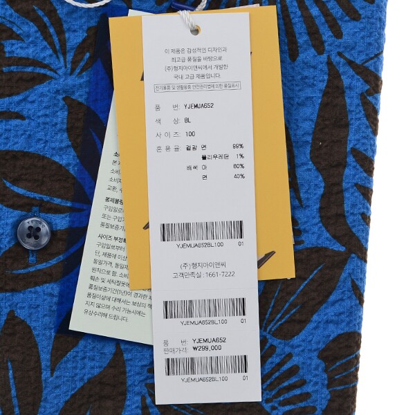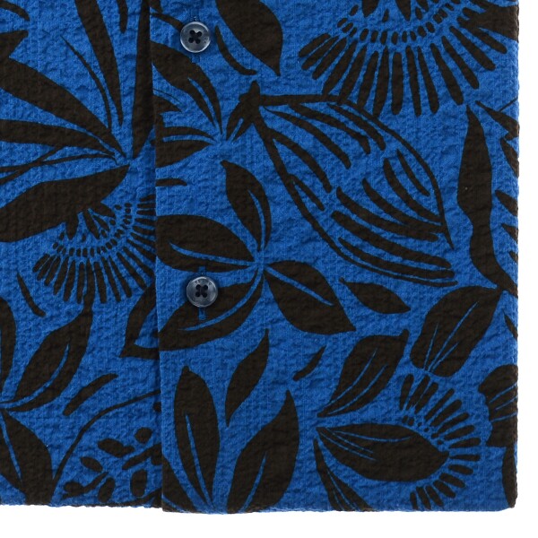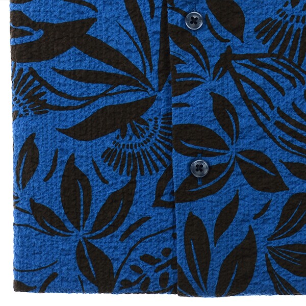 프란스 수입 소재인 "드보" 코튼 스판 프린트 써커 소재를 사용한 트로피컬 패턴으로?너무 화려하지 않으며 고급스러운 느낌을 주며스트레치가 되어 활동성이 좋고 워싱을 하여 내추럴하면서 부드럽고 시원한 느낌을 주고 흡습성,통기성이 좋아 쾌적한 착용감을 주는 밑단 일자로 다림질이 필요 없는 써커 프린트 슬림핏 반소매