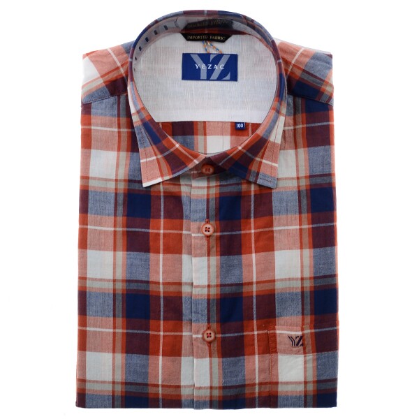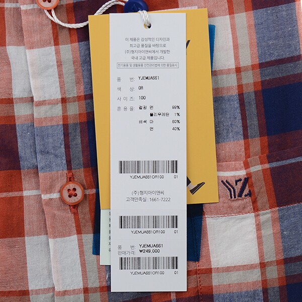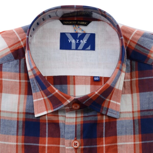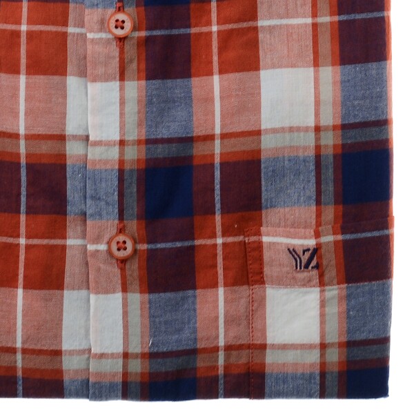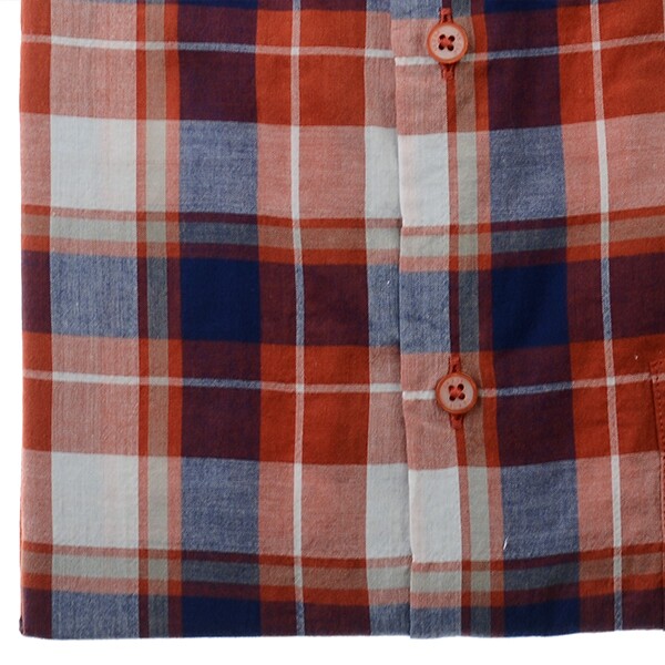 네이비/오렌지 컬러감의 마드라스 변형 체크에 요철감이 격자 형태로 들어가 있는 약써커 원단으로 내추럴하며 멋스러운 코튼 스판으로 얇고 통기성,흡습성이 좋으며 경쾌한 컬러감으로 밑단을 일자로 만들어 놓은 경쾌한 컬러감의 체크 패턴 일반핏 반소매