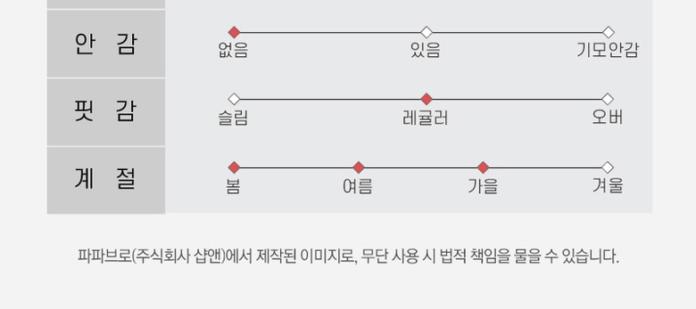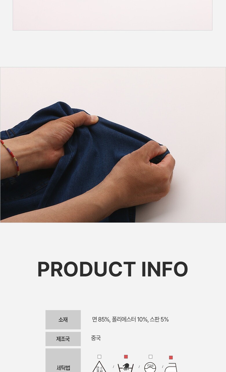 1. 제품 소재 (섬유의 조성 또는 혼용률을 백분율로 표시, 기능성인 경우 성적서 또는 허가서) | 면95%, 폴리에스터10%, 스판5% |