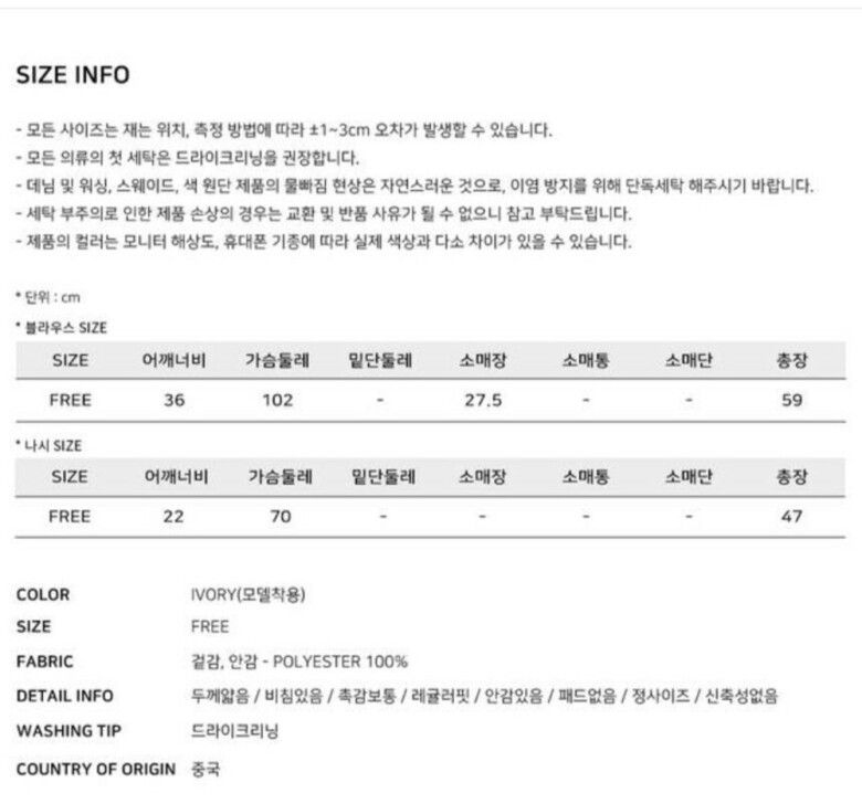 | 6. 세탁방법 및 취급시 주의사항 | 상품상세참조 |