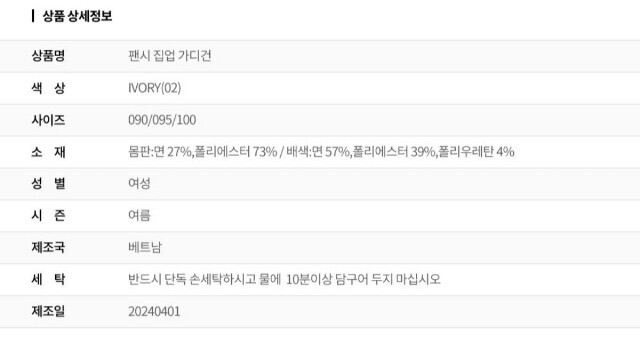 | 1. 제품 소재 (섬유의 조성 또는 혼용률을 백분율로 표시, 기능성인 경우 성적서 또는 허가서) | 상품상세참조 |