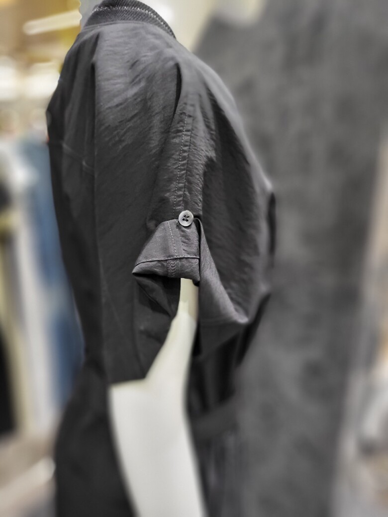 소매 롤업과 넥라인 배색 디테일이 유니크한 포인트를 더합니다.