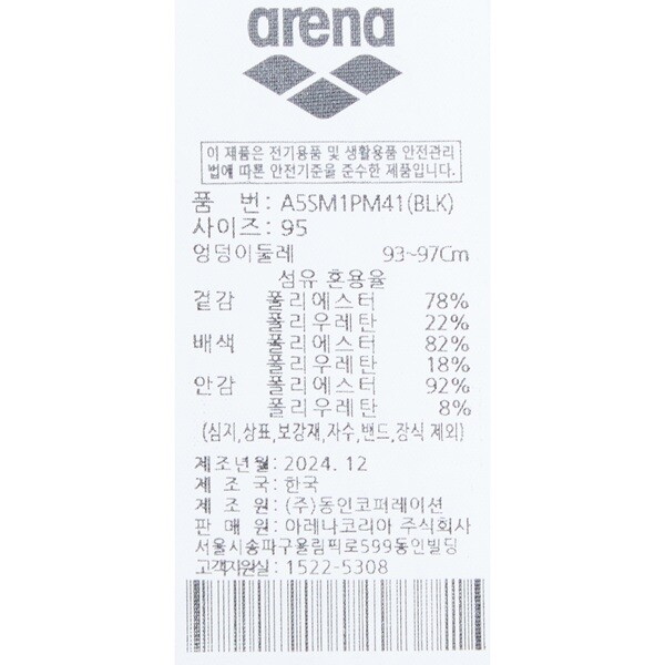 제품소재 : 겉감 폴리에스터 78 폴리우레탄 22 배색 폴리에스터 82 폴리우레탄 18 안감 폴리에스터 92 폴리우레탄 8