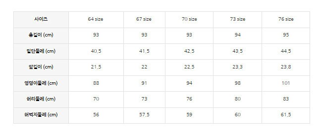 사이즈 : 64(25),67(26),70(27~28),73(28~29),76(30),79(31),82(32)