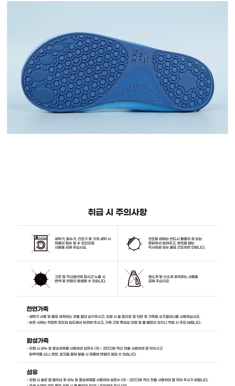 6. 취급시 주의사항 | 오염제거는 엷게 푼 세제를 부드러운 헝겊에 묻혀서 닦아주십시오. 세탁기 사용을 금합니다. 화기에 가까이하지 마세요. 오염 시 물 세척 후 통풍이 양호한 응달에서 건조 후 사용하세요. |