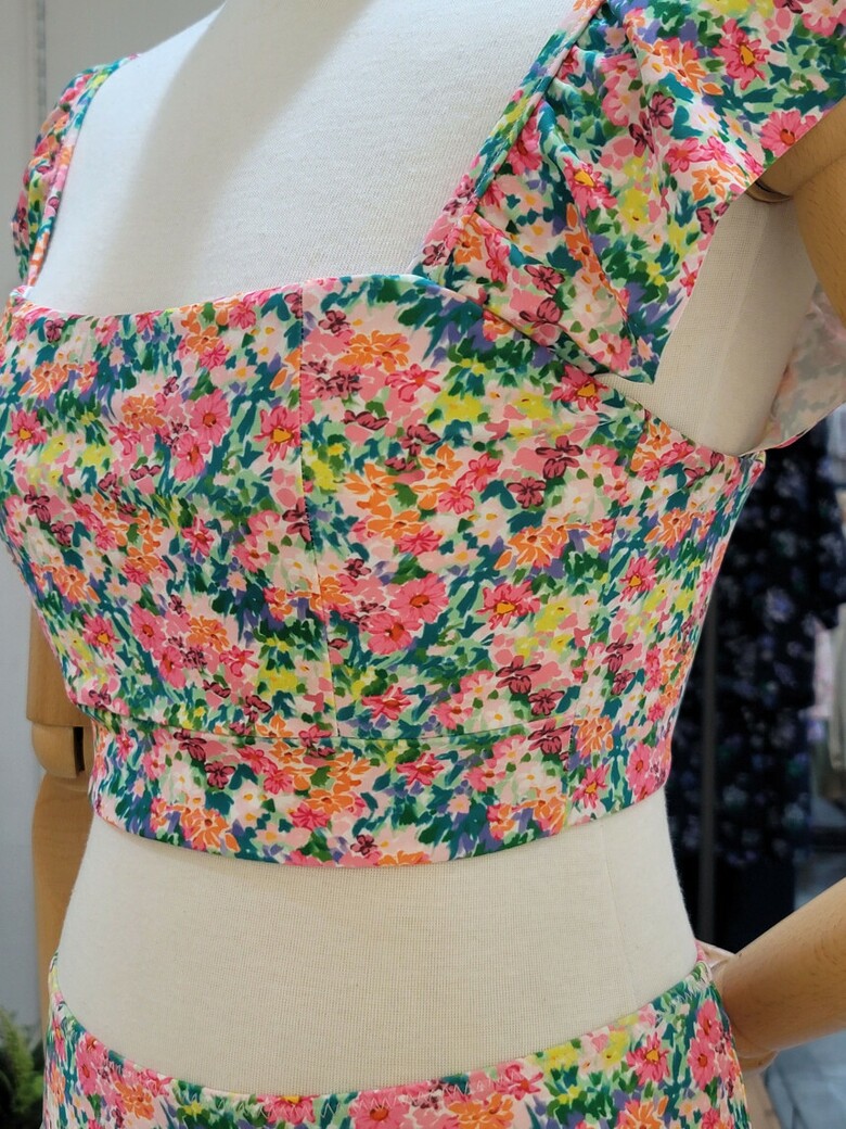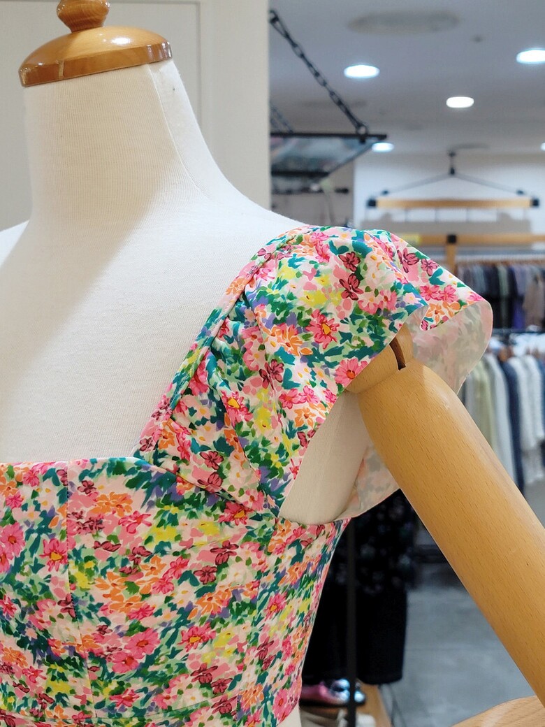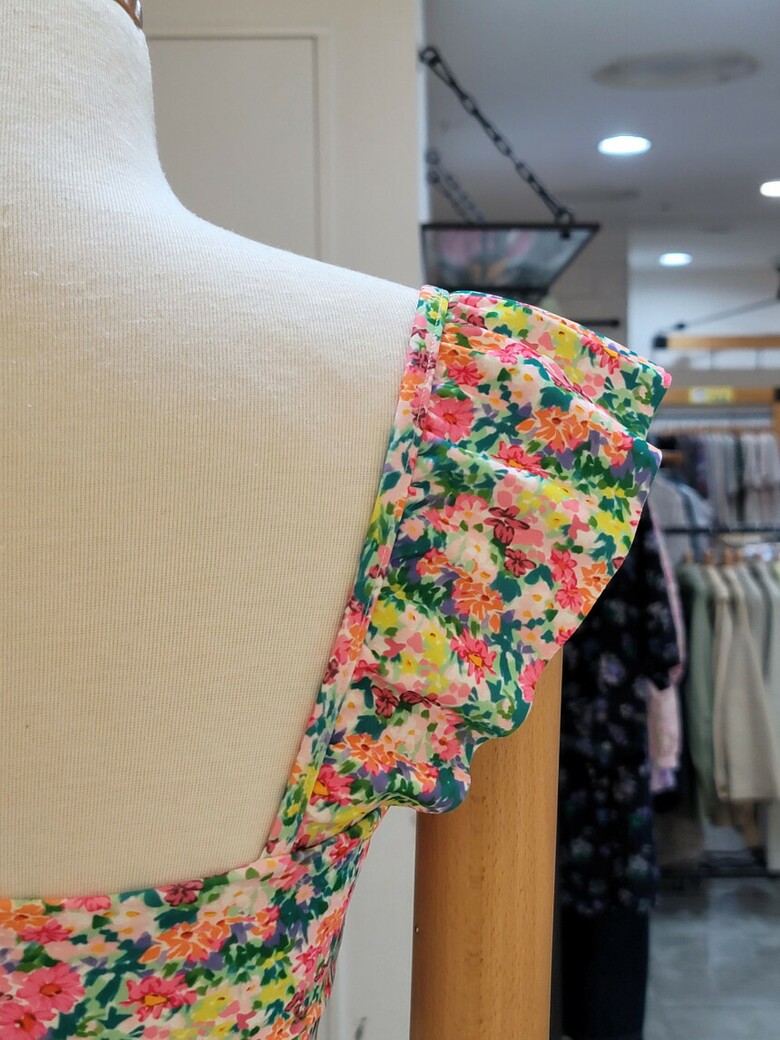 어깨에 프릴 셔링과 바텀의 스커트 라인이