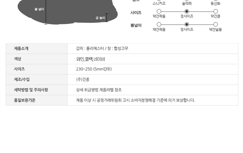 1. 제품 소재 (운동화인 경우에는 겉감, 안감을 구분하여 표시) | 상세페이지참고 |