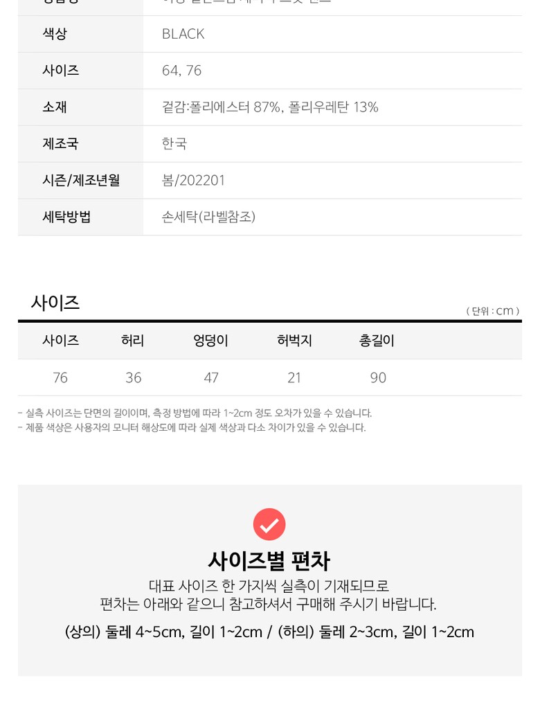 | 3. 치수 | 76사이즈기준실측 : 허리36cm, 엉덩이47cm, 허벅지21cm, 총길이90cm |