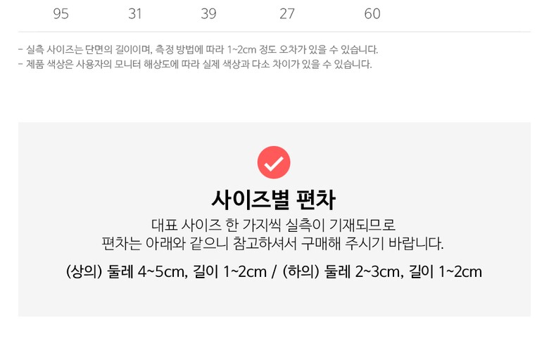 3. 치수 | 95사이즈실측기준 : 어깨31cm, 가슴39cm, 팔길이27cm, 총길이60cm |