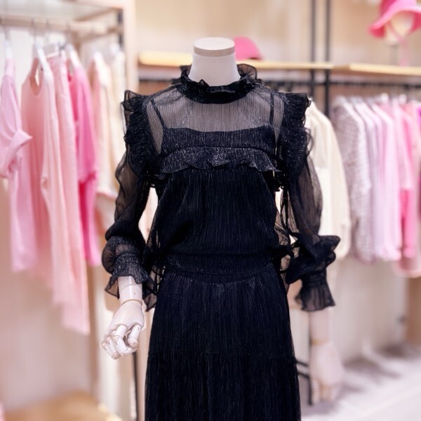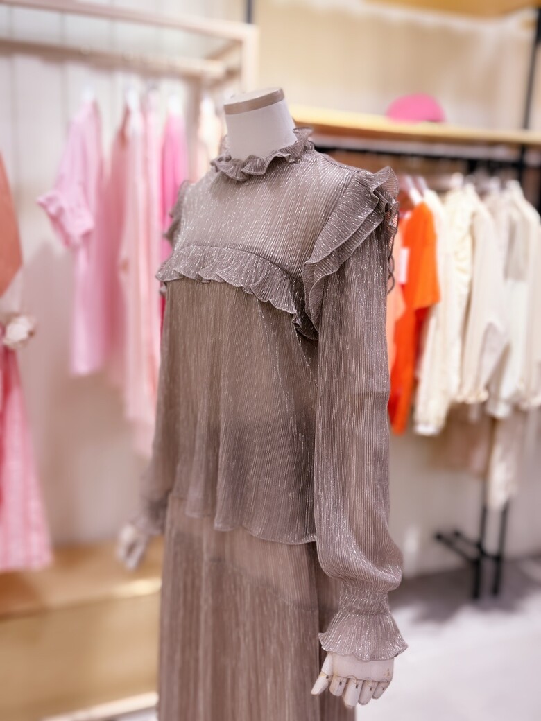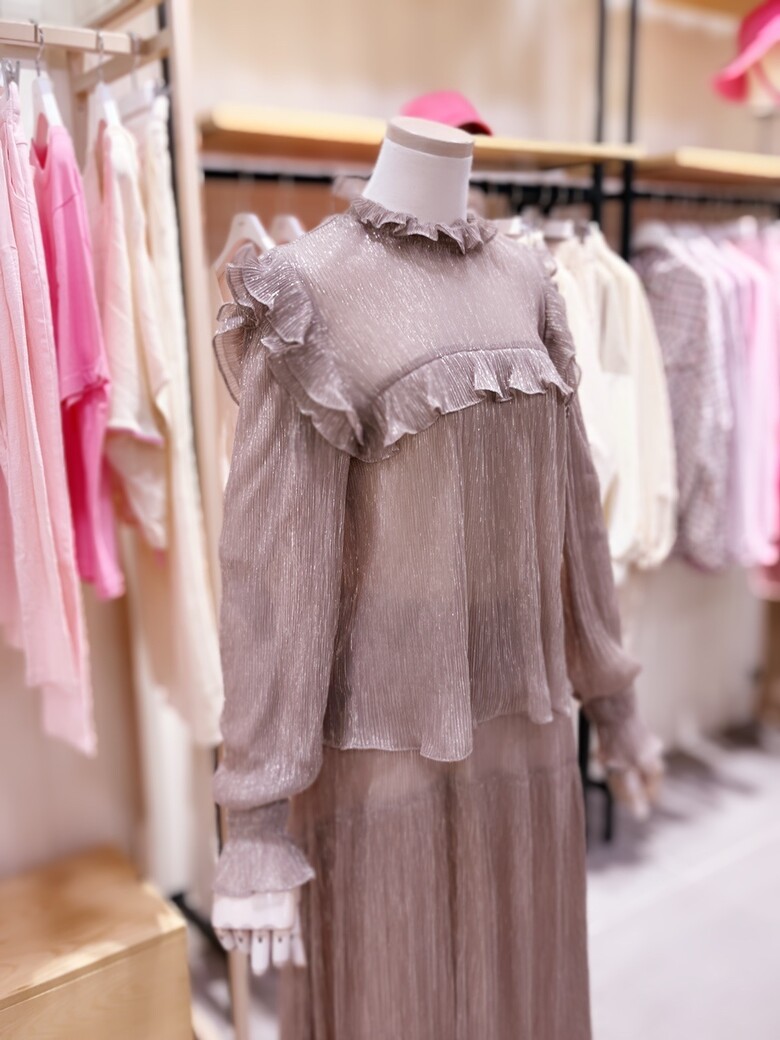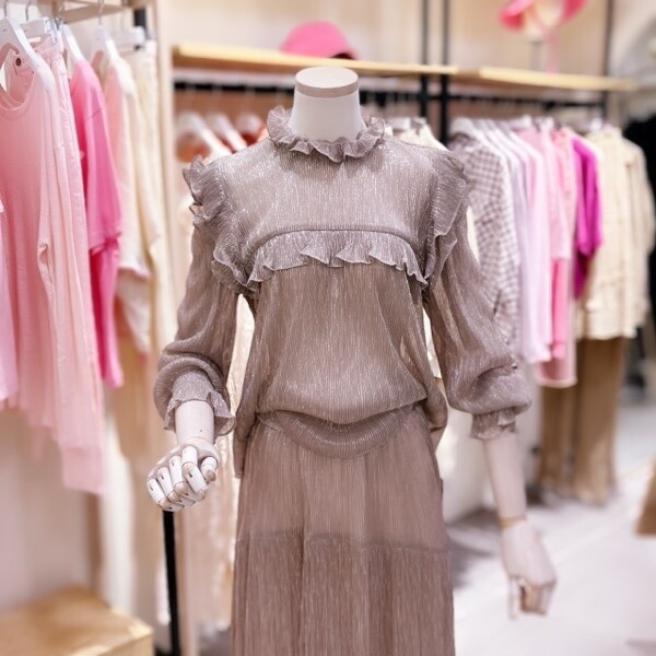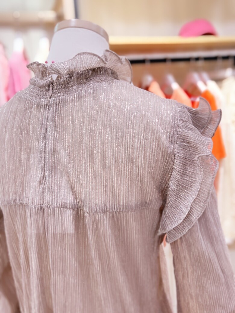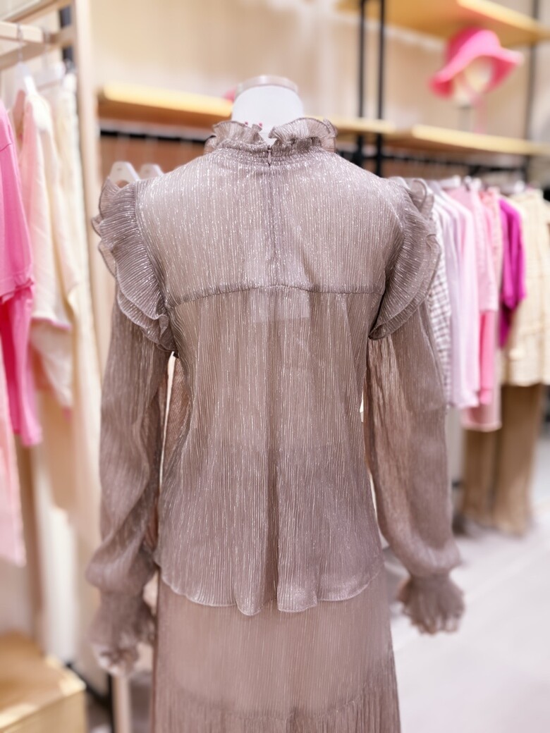 SH1DBSHF037_메탈주름지 하이넥라인 러플 블라우스