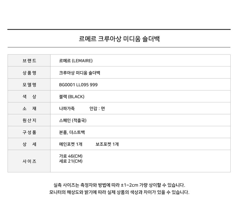 - #리본즈코리아 #BG0001LL095999 #[명품] #25SS #르메르 #크루아상 #미디움 #숄더백 #블랙 #BG0001 #LL095 #999 #남성 #가방/핸드백 #크로스/메신저백 #크로스백