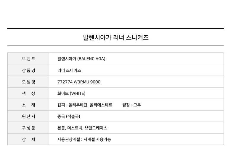 | 1. 제품 소재 (운동화인 경우에는 겉감, 안감을 구분하여 표시) | 상세페이지 참조 |