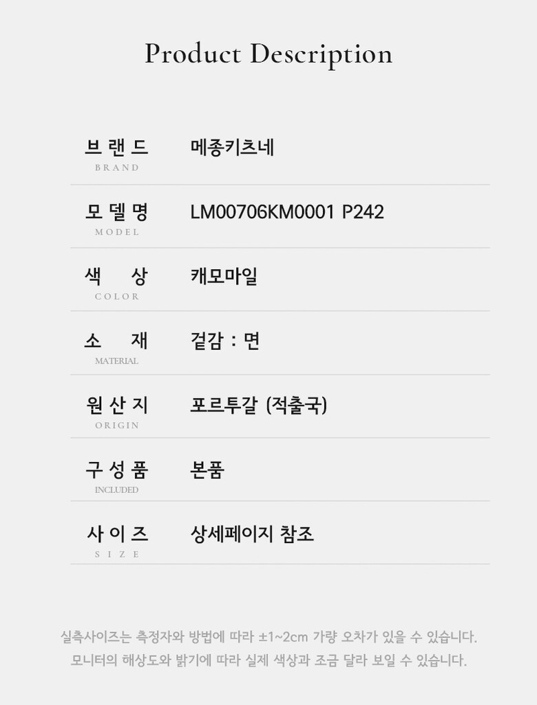 | 1. 제품 소재 (섬유의 조성 또는 혼용률을 백분율로 표시, 기능성인 경우 성적서 또는 허가서) | 상세페이지 참조 |