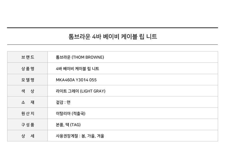 - #리본즈코리아 #MKA460AY3014055 #[명품] #톰브라운 #4바 #베이비 #케이블 #립 #니트 #라이트그레이 #MKA460A #Y3014 #055 #남성 #의류 #니트/가디건