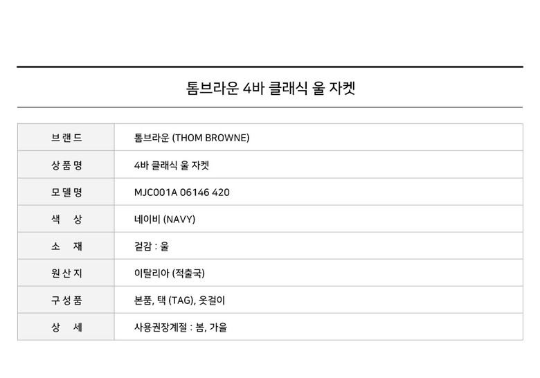 - #리본즈코리아 #MJC001A06146420 #[명품] #톰브라운 #4바 #클래식 #울 #자켓 #네이비 #MJC001A #06146 #420 #남성 #의류 #아우터 #캐주얼자켓