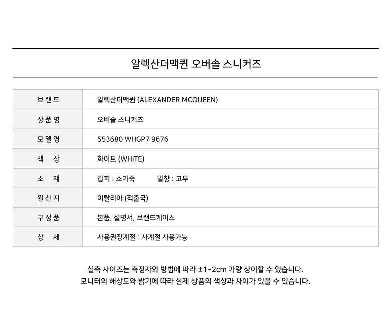 [명품] 알렉산더맥퀸 오버솔 스니커즈 화이트 553680 WHGP7 9676