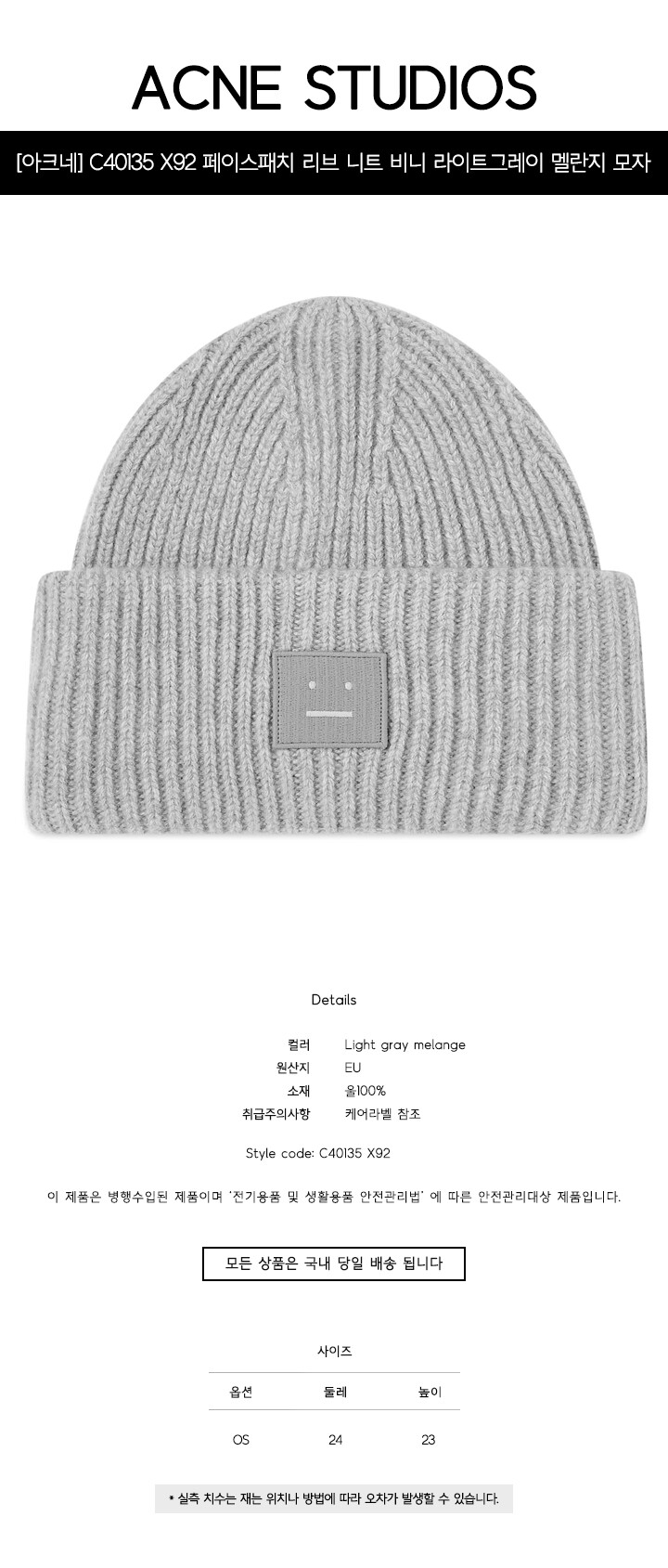 [명품] C40135 X92 페이스패치 리브 니트 비니 라이트그레이 멜란지 모자 /