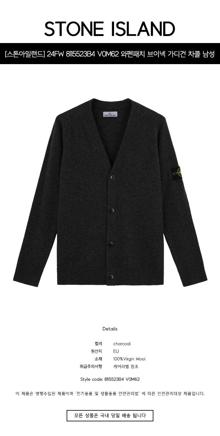 - #리본즈코리아 #8115523B4V0M62 #[명품] #24FW #8115523B4 #V0M62 #와펜패치 #브이넥 #가디건 #차콜 #남성 #자켓 #/ #의류 #니트/가디건