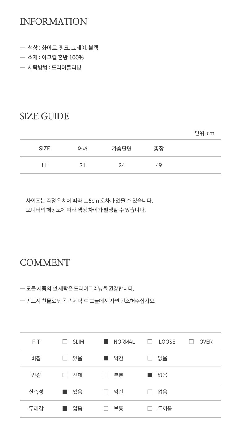 | 1. 제품 소재 (섬유의 조성 또는 혼용률을 백분율로 표시, 기능성인 경우 성적서 또는 허가서) | 상세페이지 참조 |