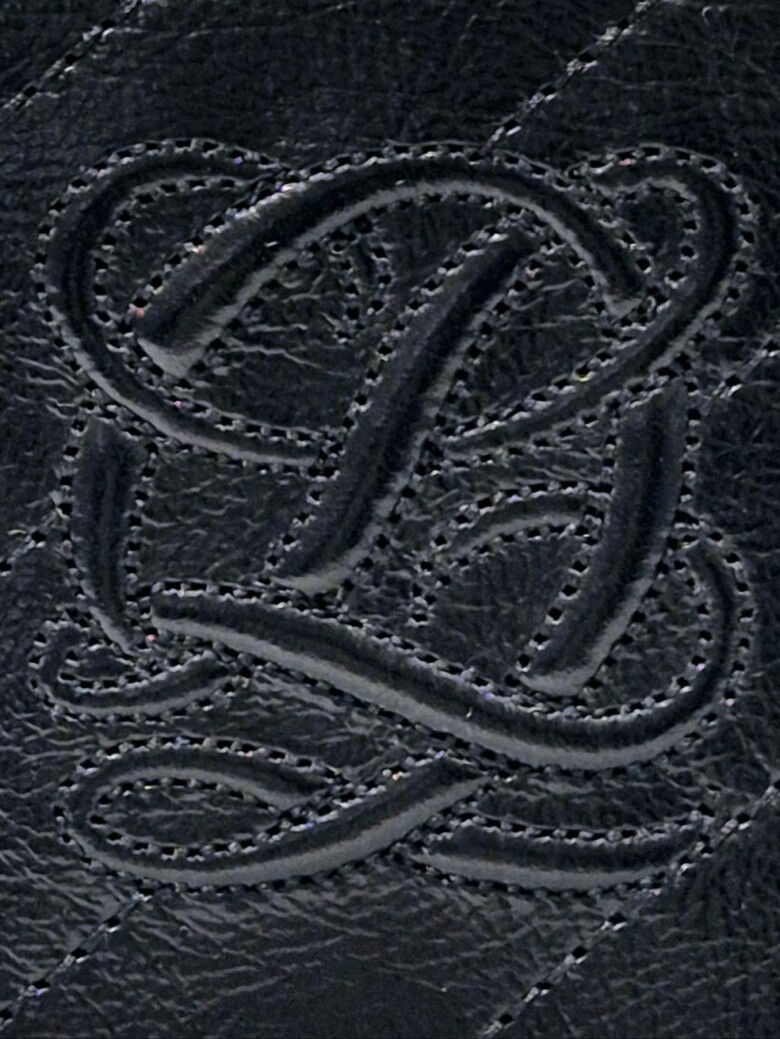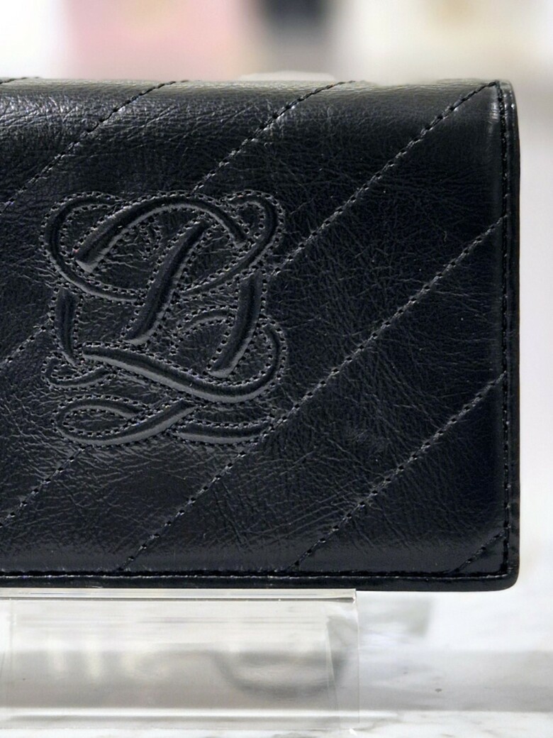 볼륨감 있는 심볼 자수가 포인트 되는 페미닌 무드의 크랙 소재 반지갑.