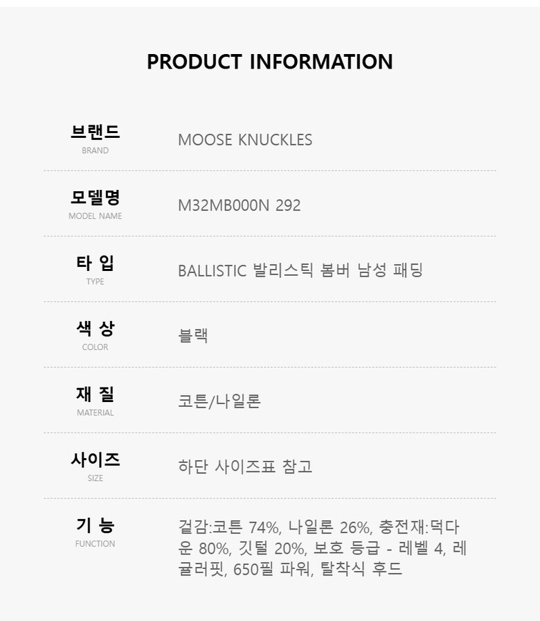 [명품] 무스너클 M32MB000N 292 BALLISTIC 발리스틱 봄버 남성 패딩