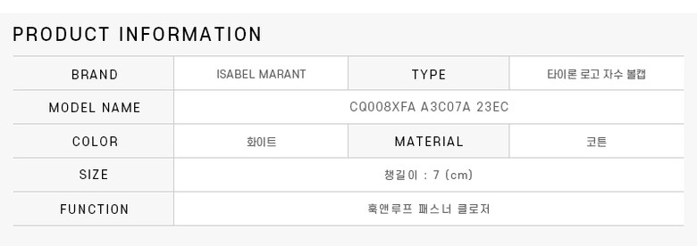 - #리본즈코리아 #CQ008XFAA3C07A23EC #[명품] #이자벨마랑 #CQ008XFA #A3C07A #23EC #TYRON #타이론 #부클 #로고 #볼캡 #여성 #패션잡화 #모자 #야구모자