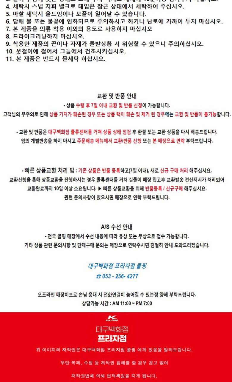 9. A/S 책임자와 전화번호 | AS 및 기타 문의 사항은 해당 매장 [김연호,053-256-4277] 으로 전화주시면 감사하겠습니다. |