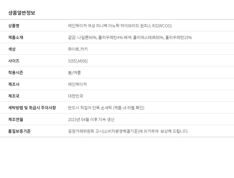 | 1. 제품 소재 (섬유의 조성 또는 혼용률을 백분율로 표시, 기능성인 경우 성적서 또는 허가서) | 상세설명참고 |