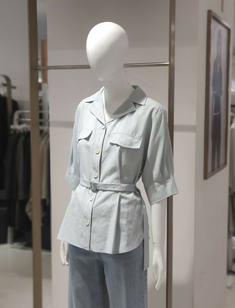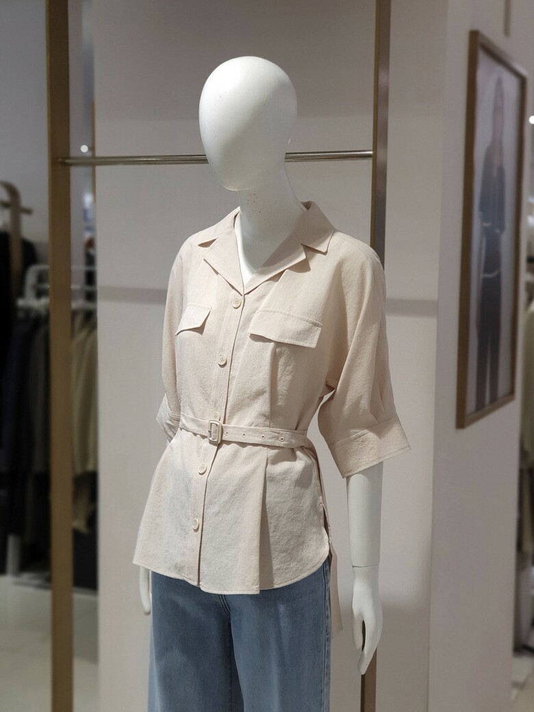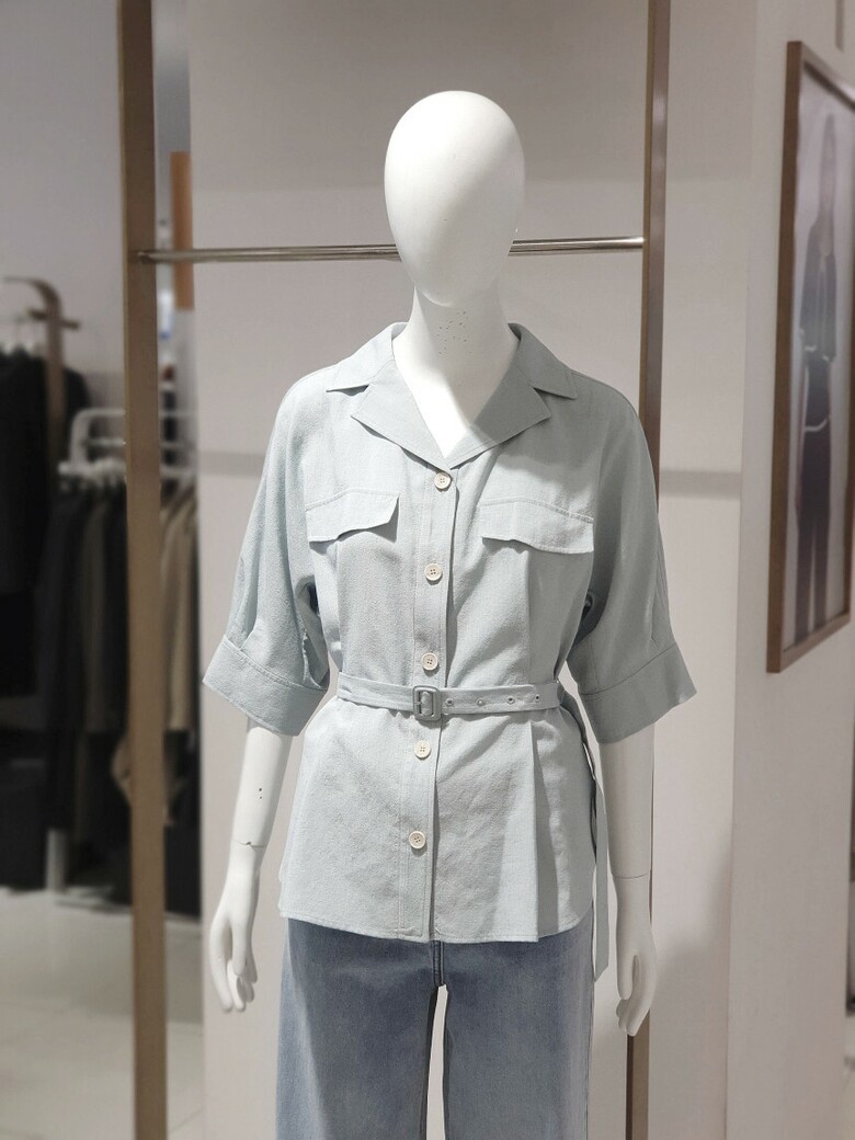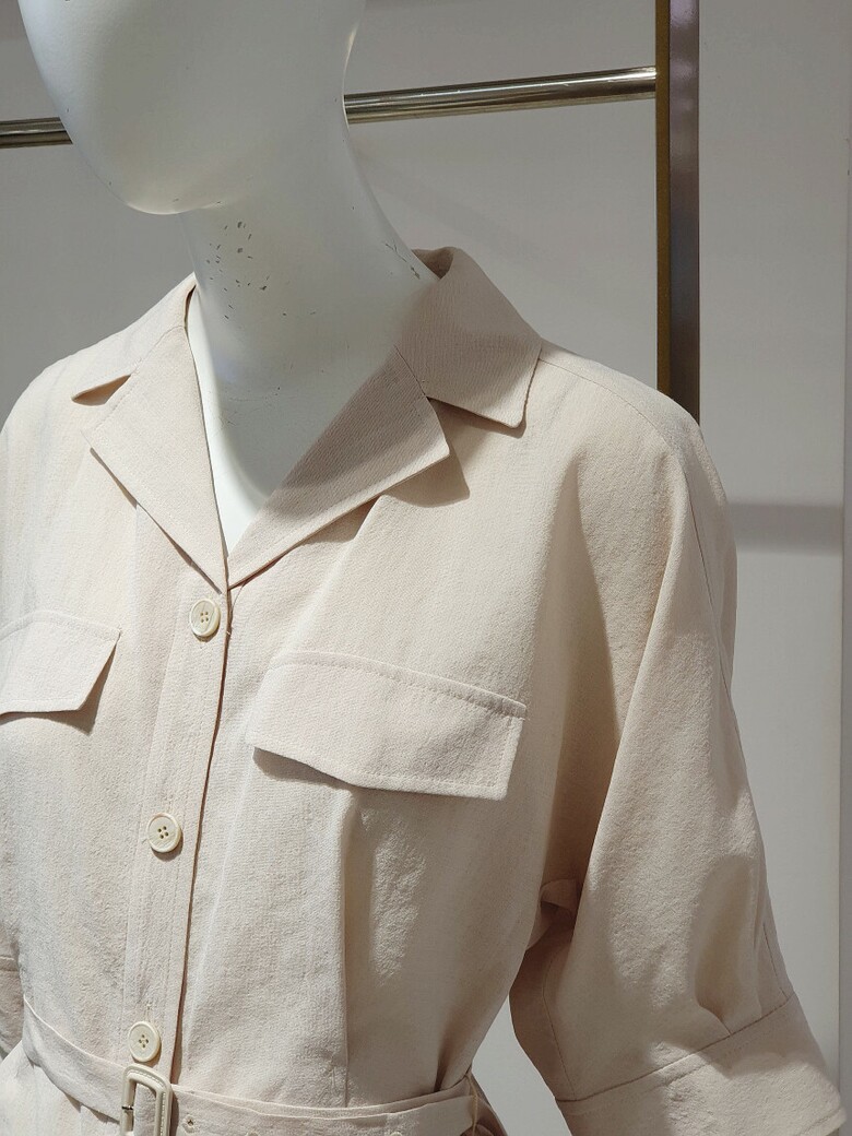 플랩 포켓 장식과 벨트 구성으로 포인트 연출이
