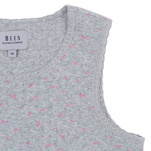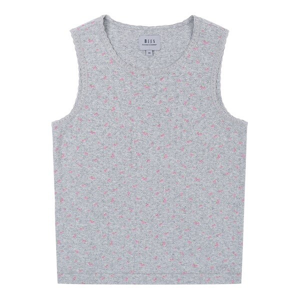 그레이 컬러의 스카시 소재 플라워 프린트 슬리브리스입니다. 잔잔한 핑크 컬러의 작은 플라워 프린트가 사랑스러운 아이템으로 가디건과 함께 코디하거나 단독으로 코디하여도 좋은 아이템입니다.