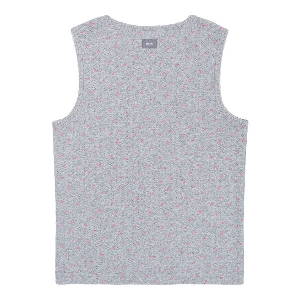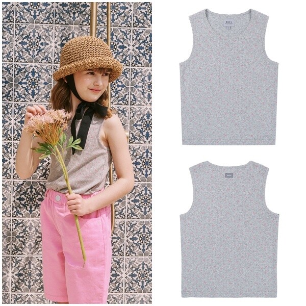 그레이 컬러의 스카시 소재 플라워 프린트 슬리브리스입니다. 잔잔한 핑크 컬러의 작은 플라워 프린트가 사랑스러운 아이템으로 가디건과 함께 코디하거나 단독으로 코디하여도 좋은 아이템입니다.