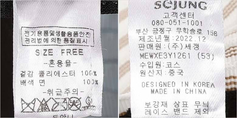 | 2. 소재 | 겉감:폴리에스터100% 배색:면100% |