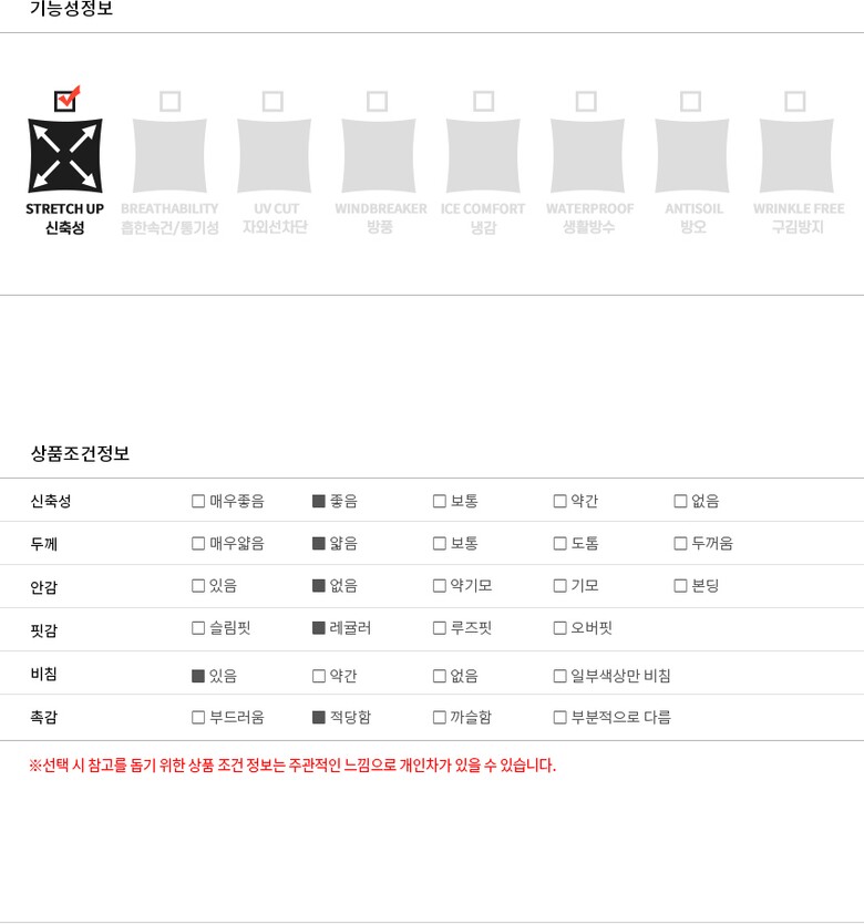 | 6. 세탁방법 및 취급시 주의사항 | 개별세탁권장/온수세탁금지,화기금지,표백금지 |