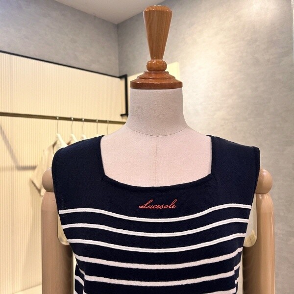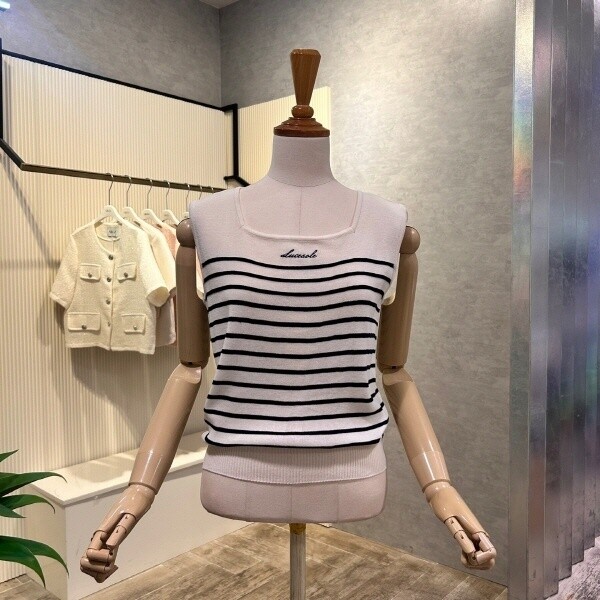 2025년 s/s 신상?배색 스퀘어 넥 민소매 니트 입니다. 사랑스러운 디자인으로 코디 아이템 입니다.?