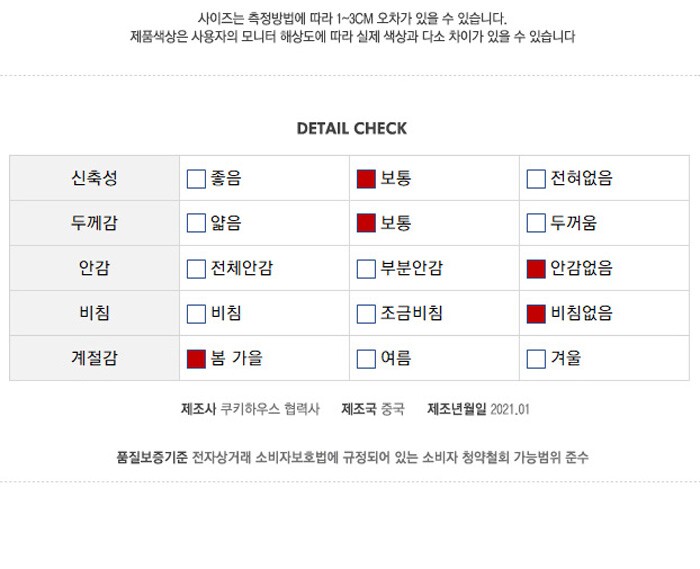 | 1. 제품 소재 (섬유의 조성 또는 혼용률을 백분율로 표시, 기능성인 경우 성적서 또는 허가서) | 상세페이지참조 |