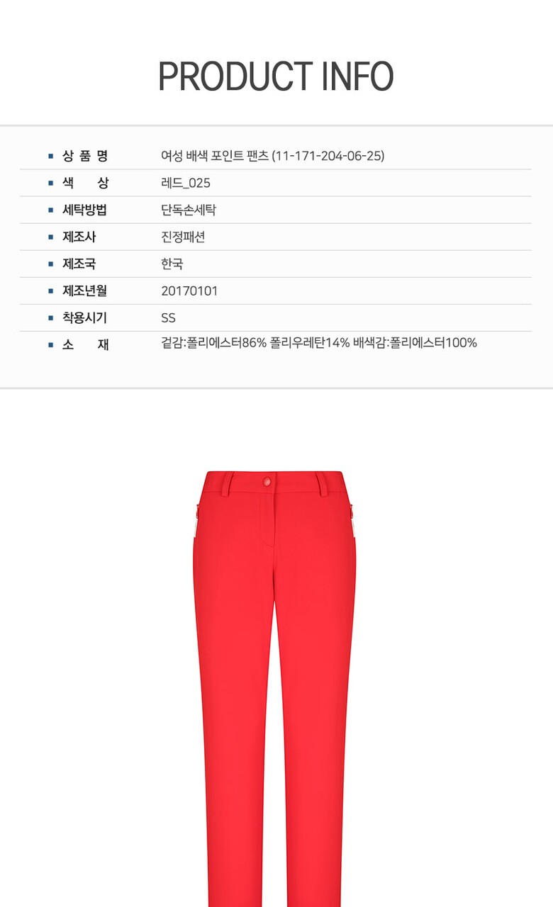 1. 제품 소재 (섬유의 조성 또는 혼용률을 백분율로 표시, 기능성인 경우 성적서 또는 허가서) 겉감:폴리에스터86% 폴리우레탄14% 배색감:폴리에스터100%