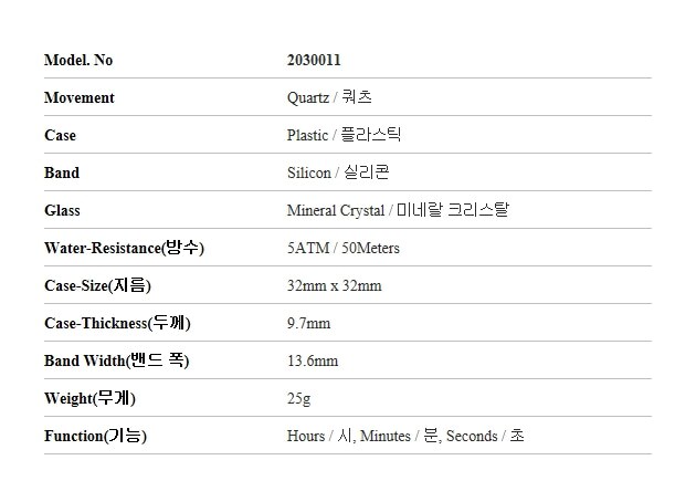 | 7. 주요 사양 | 실리콘 시계 쿼츠 |