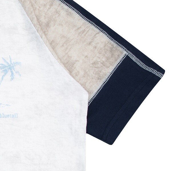 베이지, 네이비 배색이 들어간 컬러 블록 반팔 티셔츠입니다.