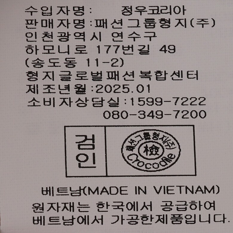 | 1. 제품 소재 (섬유의 조성 또는 혼용률을 백분율로 표시, 기능성인 경우 성적서 또는 허가서) | 상품상세참조 |