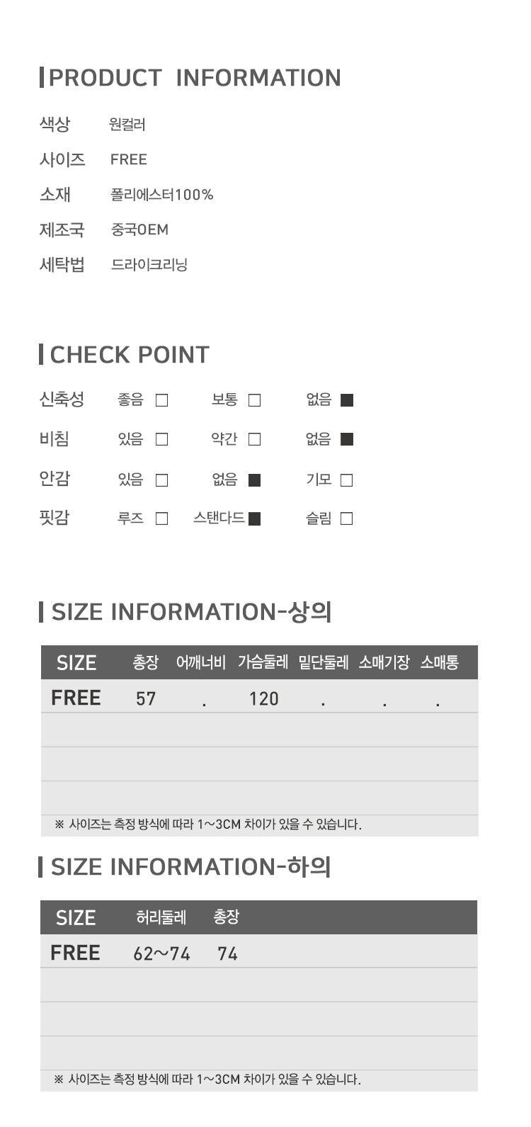 | 1. 제품 소재 (섬유의 조성 또는 혼용률을 백분율로 표시, 기능성인 경우 성적서 또는 허가서) | 상세페이지참고 |