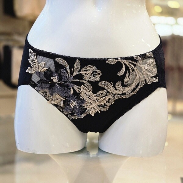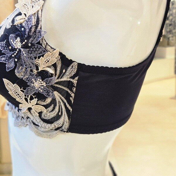 섬세한 자수레이스와 고급스런 모티브의 조화가 아름다운 브라팬티 세트로 4/5컵 높이에 넓은 날개로 큰컵까지 자연스럽게 보정되는 피팅감 좋은 브라와 햄스타일 팬티의 세트 제품