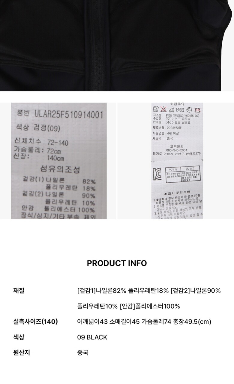 세탁방법 및 취급시 주의사항 : [겉감1]나일론82% 폴리우레탄18% [겉감2]나일론90% 폴리우레탄10% [안감]폴리에스터100%